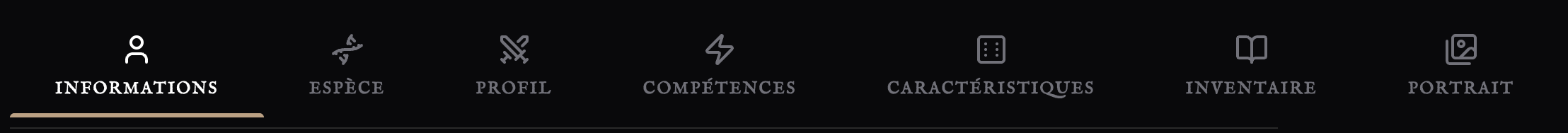 Un système de création complet en 7 étapes : informations, espèce, profil, compétences, caractéristiques, inventaire et portrait.